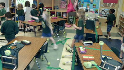 Then he created mischief around the room!!! Check out the distruction! It included: bookbags off of their hooks, pencil boxes mixed up, disorganized calendar and days of the week, footprints around the classroom, the toilet water dyed green, dumped out blocks, clovers all over the floor, streamers abound, and all the traps that the children set to catch him.....tripped but did not catch that silly booger!!! Can you believe it? :) He was'nt all bad though. He left them some magic leprechaun juice mix and some elfin cookies ;) I'll get that sucker next year by golly!